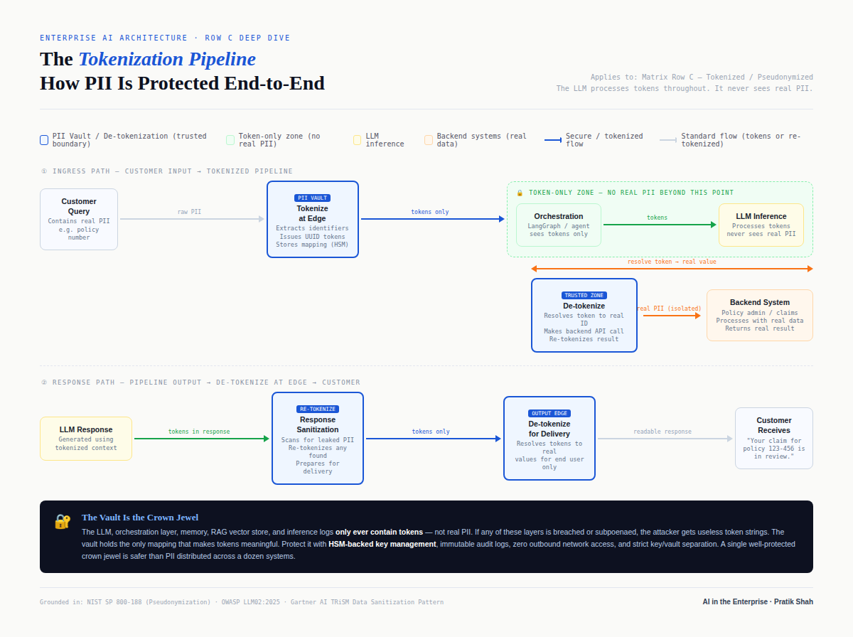 As I refined the model, one pattern kept standing out as especially practical for regulated environments: tokenize or pseudonymize sensitive data as early as possible, move tokens through the AI pipeline wherever feasible, and only detokenize inside secure backend zones when enterprise systems actually need the real values.