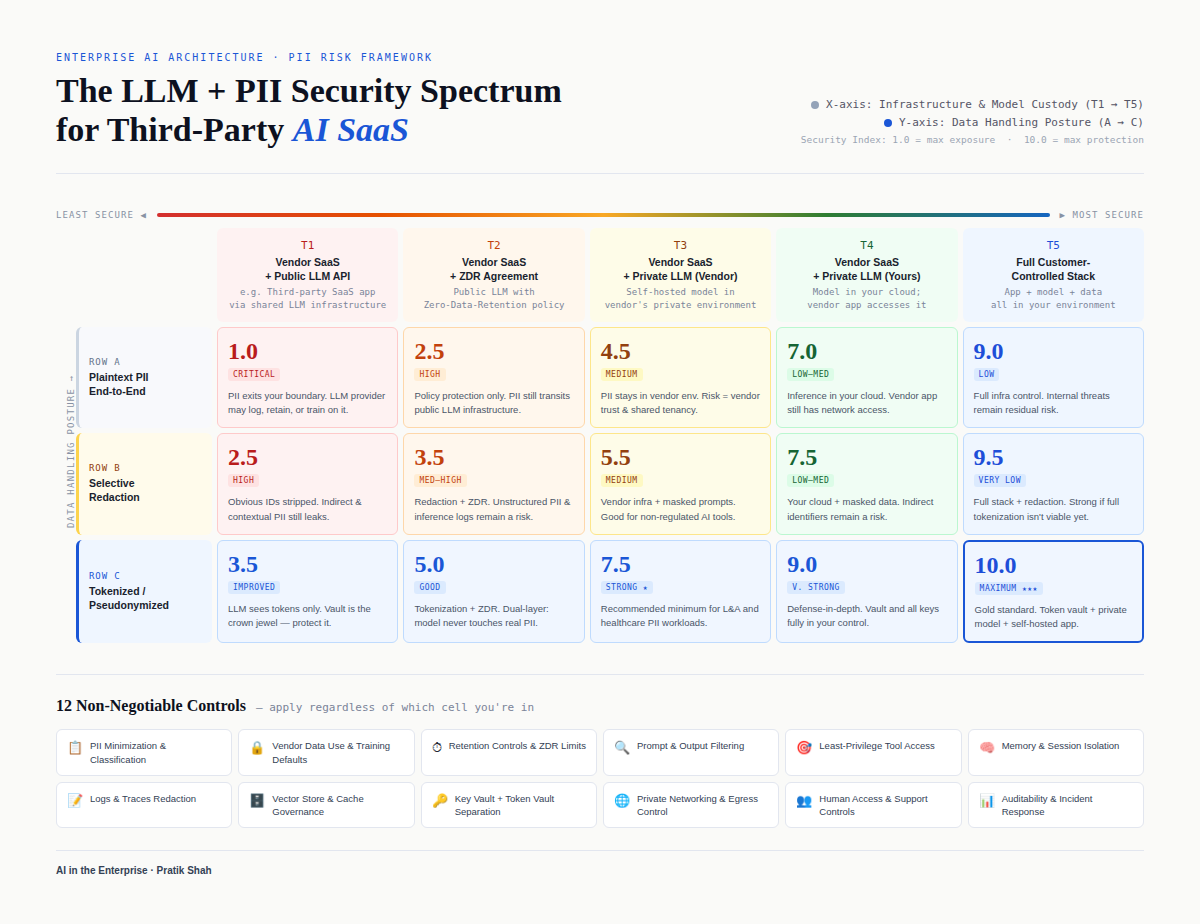 What I’m sharing here is the result so far: a practical security spectrum and matrix that helps structure the conversation around LLMs, PII, and third-party AI SaaS in regulated enterprise environments.