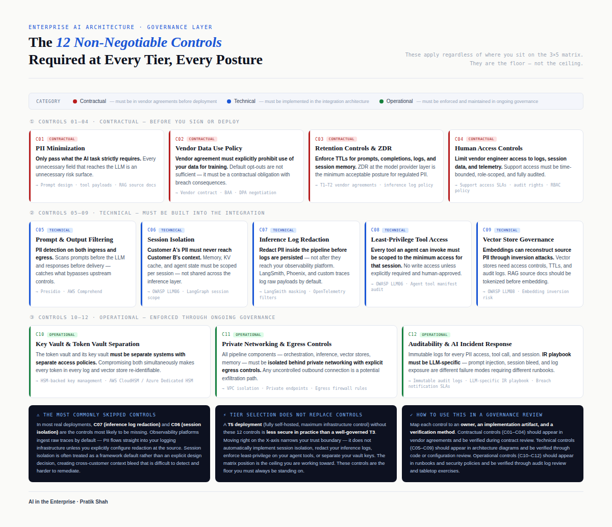 That is why the spectrum/matrix also includes a cross-cutting layer of non-negotiable controls. These are not hardening items to “add later” once the pilot works; they are the controls that determine whether a promising architecture stays safe under real traffic and real operational pressure.